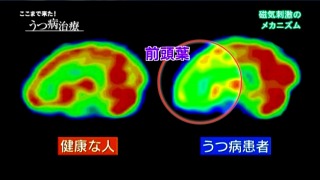 うつ病の患者のうち薬物療法などで治らない患者の脳機能を検査したところ、上の図のように前頭葉にあるDLPFC(背外側前頭前野)というエリアが活動していないことが分かりました。そのDLPFCというエリアに磁気刺激を与えることで、血流を改善し活動を活性化させたところ、うつ症状が改善したという報告がなされるようになっています。